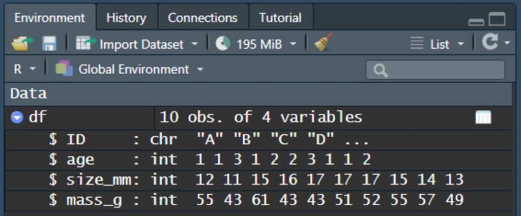 If you run this bit of code yourself, you should see the object df under the environment window in the top right pane of your RStudio.